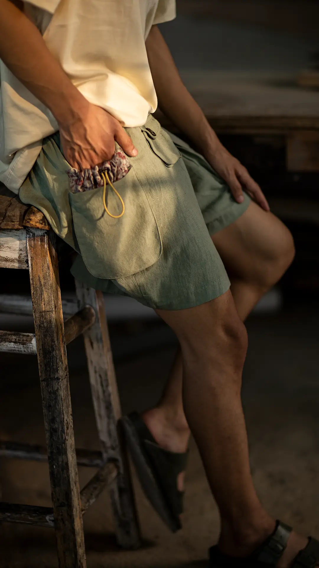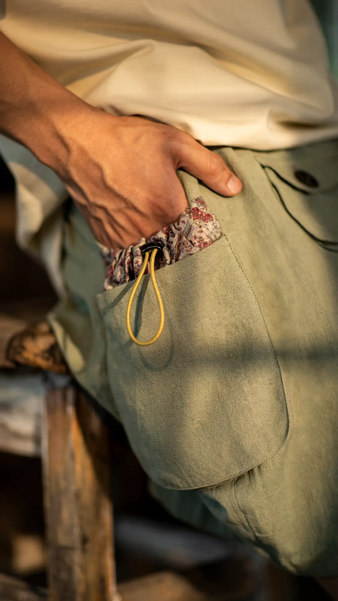 Introducing our jade utility shorts, the perfect blend of style and functionality for your resort wear needs. Whether you’re exploring the sandy beaches, strolling through local markets, or simply lounging by the pool, our jade utility shorts with multiple pockets, including a secret pocket, offers the functionality you need. Embrace resort wear that allows you to stay organised, secure, and fashionable all at once. The fabric used has a subtle texture which grows more texturous with each use hence giving it a characterful texture with every wash, adding to the charm and individuality of the shorts.